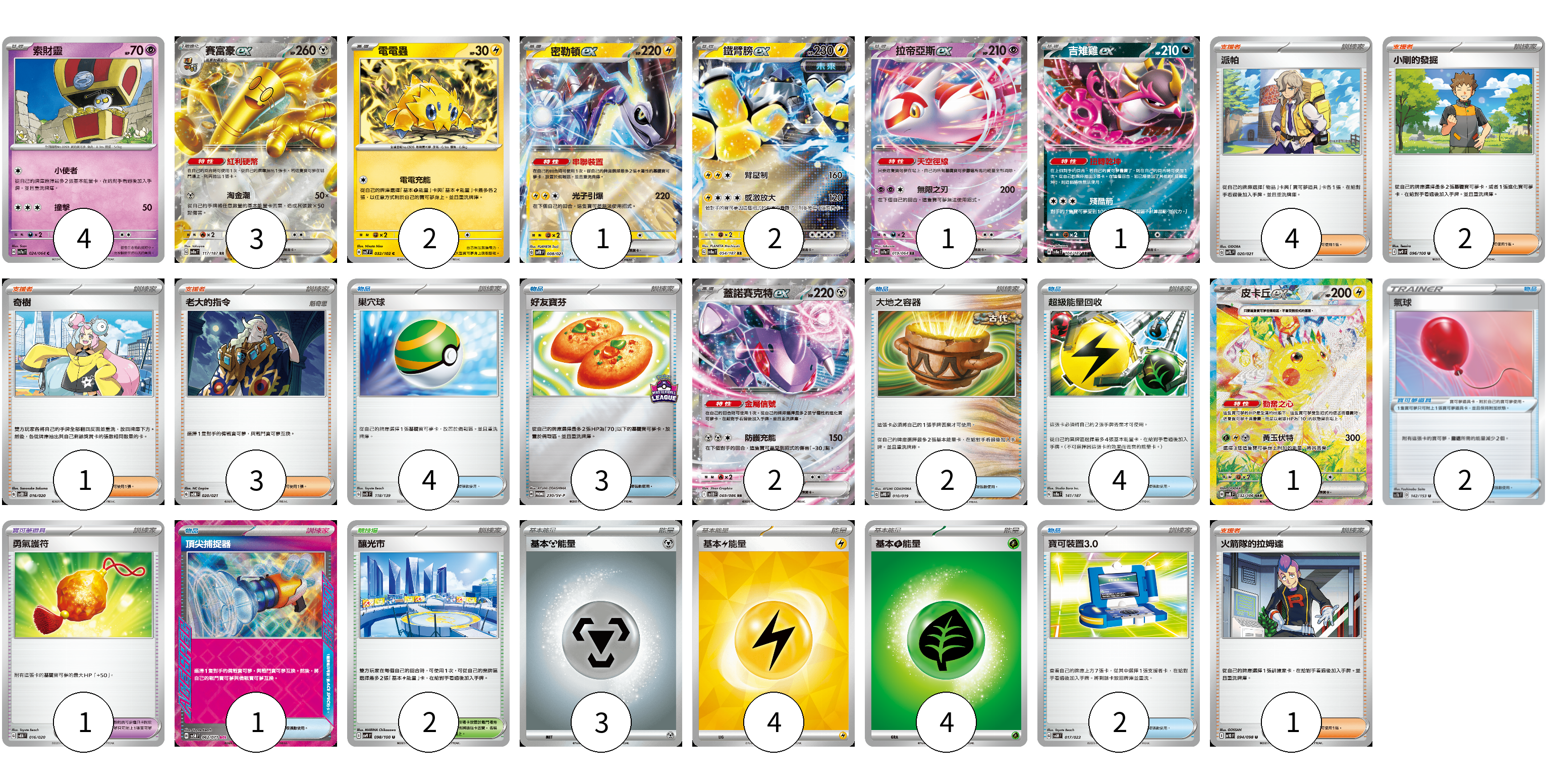牌組構築方案 以此牌組為基礎新構築牌組 顯示卡面 顯示列表 寶可夢卡(17) 4 3 2 1 2 1 1 2 1 寶可夢道具(3) 2 1 物品卡(16) 4 3 2 4 1 2 支援者卡(11) 4 2 1 3 1 競技場卡(2) 2 能量卡(11) 3 4 4 寶可夢卡(17) 卡牌名稱 張數 卡牌名稱 張數 索財靈 SV7a 024/064 04 賽富豪ex SV8a 117/187 03 電電蟲 SV7 032/102 02 密勒頓ex SVTR 008/021 01 鐵臂膀ex SV8a 054/187 02 拉帝亞斯ex SV7a 019/064 01 吉雉雞ex SV8a 104/187 01 蓋諾賽克特ex SV11B 069/086 02 皮卡丘ex SV8 132/106 01 寶可夢道具(3) 卡牌名稱 張數 卡牌名稱 張數 氣球 SC1b 142/153 02 勇氣護符 SVEM 016/020 01 物品卡(16) 卡牌名稱 張數 卡牌名稱 張數 巢穴球 SVD 118/139 04 好友寶芬 SV-P 230/SV-P 03 大地之容器 SVTG 010/019 02 超級能量回收 SV8a 141/187 04 頂尖捕捉器 SV5M 062/071 01 寶可裝置3.0 SVAM 017/023 02 支援者卡(11) 卡牌名稱 張數 卡牌名稱 張數 派帕 SVTL 020/021 04 小剛的發掘 SV9 096/100 02 奇樹 SVOD 016/020 01 老大的指令 SVOM 020/021 03 火箭隊的拉姆達 SV10 094/098 01 競技場卡(2) 卡牌名稱 張數 卡牌名稱 張數 釀光市 SV9 098/100 02 能量卡(11) 卡牌名稱 張數 卡牌名稱 張數 基本【鋼】能量 M-P MET 03 基本【雷】能量 SVQP LIG 04 基本【草】能量 M-P GRA 04 以此牌組為基礎新構築牌組 牌組編碼 zqprPP-tScSzB-zHFwZa copy 列印牌組單 牌組編碼已複製 分享至SNS