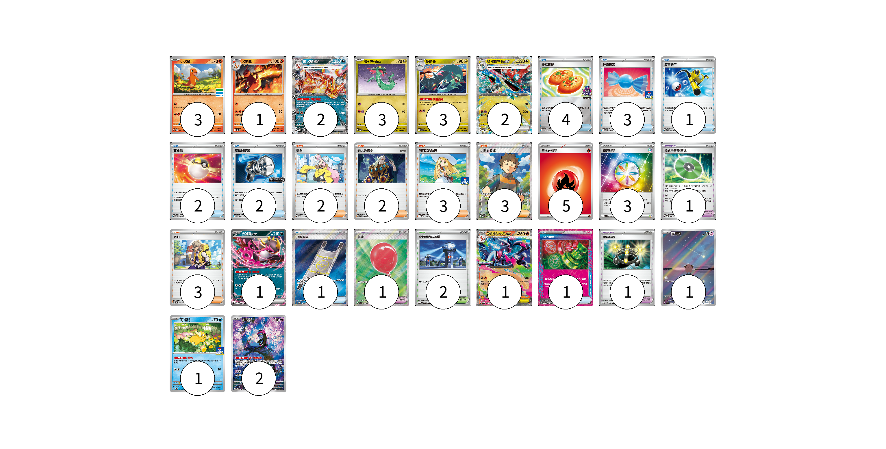 牌組構築方案 以此牌組為基礎新構築牌組 顯示卡面 顯示列表 寶可夢卡(20) 3 1 2 3 3 2 1 1 1 1 2 寶可夢道具(3) 1 1 1 物品卡(14) 4 3 1 2 2 1 1 支援者卡(13) 2 2 3 3 3 競技場卡(2) 2 能量卡(8) 5 3 寶可夢卡(20) 卡牌名稱 張數 卡牌名稱 張數 小火龍 SV-P 232/SV-P 03 火恐龍 SVQL 002/022 01 噴火龍ex SVTL 006/021 02 多龍梅西亞 SV6 079/101 03 多龍奇 SV6 080/101 03 多龍巴魯托ex SV6 081/101 02 吉雉雞ex SVOM 009/021 01 超級噴火龍Xex M-P 029/M-P 01 皮寶寶 SV3 113/108 01 可達鴨 SV-P 220/SV-P 01 願增猿 SV6 107/101 02 寶可夢道具(3) 卡牌名稱 張數 卡牌名稱 張數 招式學習器 演進 SVK 025/042 01 氣球 M1L 084/063 01 學習裝置 SVTM 016/022 01 物品卡(14) 卡牌名稱 張數 卡牌名稱 張數 好友寶芬 SV-P 230/SV-P 04 神奇糖果 SV-P 104/SV-P 03 厲害釣竿 SVTH 008/018 01 高級球 SVTL 012/021 02 反擊捕捉器 SV-P 136/SV-P 02 夜間擔架 M1L 083/063 01 不公印章 SV5a 053/066 01 支援者卡(13) 卡牌名稱 張數 卡牌名稱 張數 奇樹 SVTM 017/022 02 老大的指令 SVTG 019/019 02 莉莉艾的決意 M-P 018/M-P 03 小剛的發掘 SV9 123/100 03 派帕 SV4a 180/190 03 競技場卡(2) 卡牌名稱 張數 卡牌名稱 張數 火箭隊的監視塔 SV10 096/098 02 能量卡(8) 卡牌名稱 張數 卡牌名稱 張數 基本火能量 sv-p FIR 05 夜光能量 SVK 042/042 03 以此牌組為基礎新構築牌組 牌組編碼 zqrJTc-gCDHms-pbUqXe copy 列印牌組單 牌組編碼已複製 分享至SNS