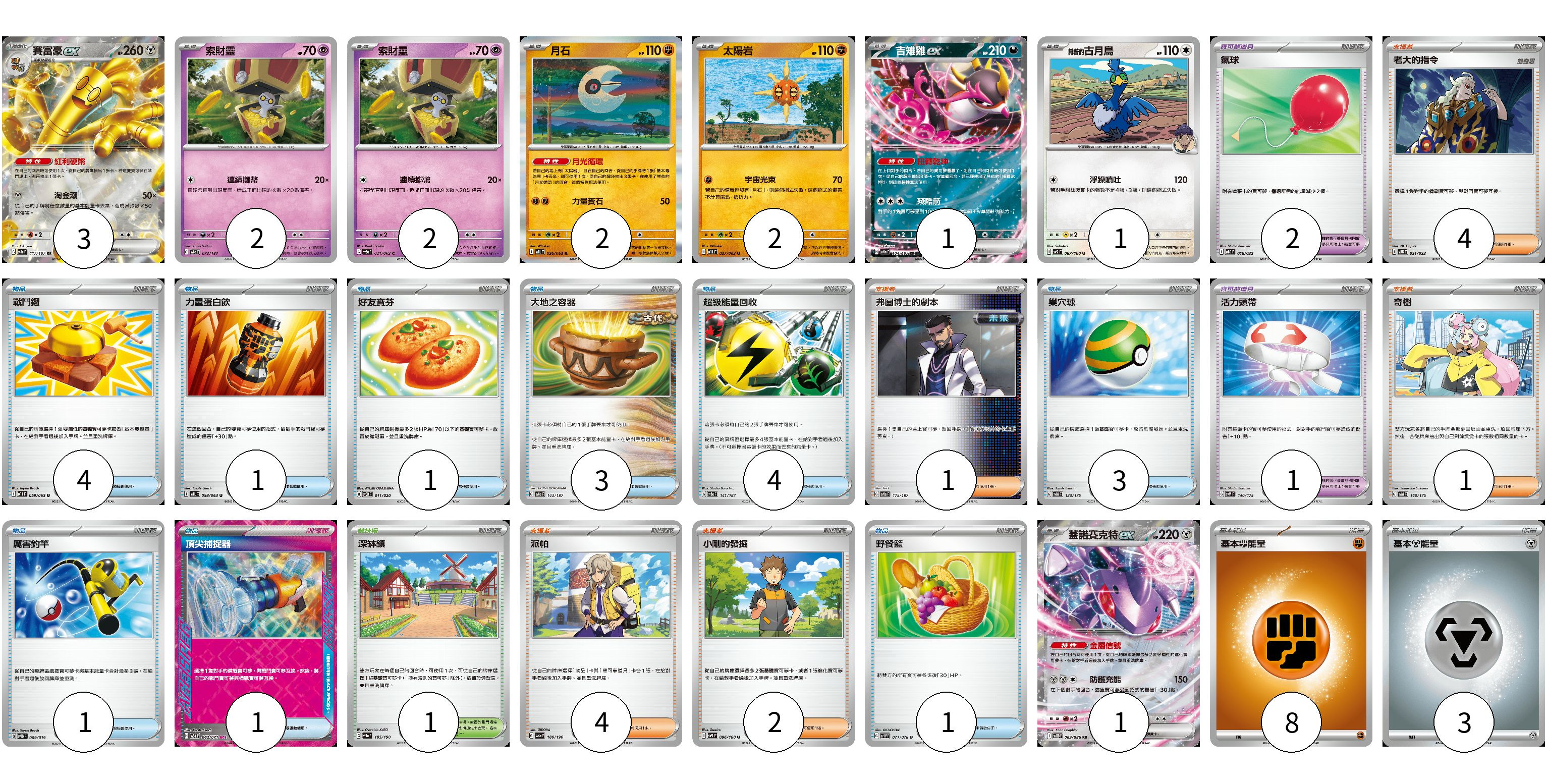 牌組構築方案 以此牌組為基礎新構築牌組 顯示卡面 顯示列表 寶可夢卡(14) 3 2 2 2 2 1 1 1 寶可夢道具(3) 2 1 物品卡(19) 4 1 1 3 4 3 1 1 1 支援者卡(12) 4 1 1 4 2 競技場卡(1) 1 能量卡(11) 8 3 寶可夢卡(14) 卡牌名稱 張數 卡牌名稱 張數 賽富豪ex SV8a 117/187 03 索財靈 SV8a 073/187 02 索財靈 SV3a 021/062 02 月石 M1L 026/063 02 太陽岩 M1L 027/063 02 吉雉雞ex SV8a 104/187 01 赫普的古月鳥 SV9 087/100 01 蓋諾賽克特ex SV11B 069/086 01 寶可夢道具(3) 卡牌名稱 張數 卡牌名稱 張數 氣球 MBD 018/022 02 活力頭帶 SVM 140/175 01 物品卡(19) 卡牌名稱 張數 卡牌名稱 張數 戰鬥鑼 M1L 059/063 04 力量蛋白飲 M1L 058/063 01 好友寶芬 SVOD 011/020 01 大地之容器 SV8a 143/187 03 超級能量回收 SV8a 141/187 04 巢穴球 SVM 133/175 03 厲害釣竿 SVTG 009/019 01 頂尖捕捉器 SV5M 062/071 01 野餐籃 SV1V 071/078 01 支援者卡(12) 卡牌名稱 張數 卡牌名稱 張數 老大的指令 MBG 021/022 04 弗圖博士的劇本 SV8a 175/187 01 奇樹 SVM 160/175 01 派帕 SV4a 180/190 04 小剛的發掘 SV9 096/100 02 競技場卡(1) 卡牌名稱 張數 卡牌名稱 張數 深缽鎮 SV4a 185/190 01 能量卡(11) 卡牌名稱 張數 卡牌名稱 張數 基本【鬥】能量 M-P FIG 08 基本【鋼】能量 M-P MET 03 以此牌組為基礎新構築牌組 牌組編碼 zrfKeD-pMwVyh-Spdpcp copy 列印牌組單 牌組編碼已複製 分享至SNS