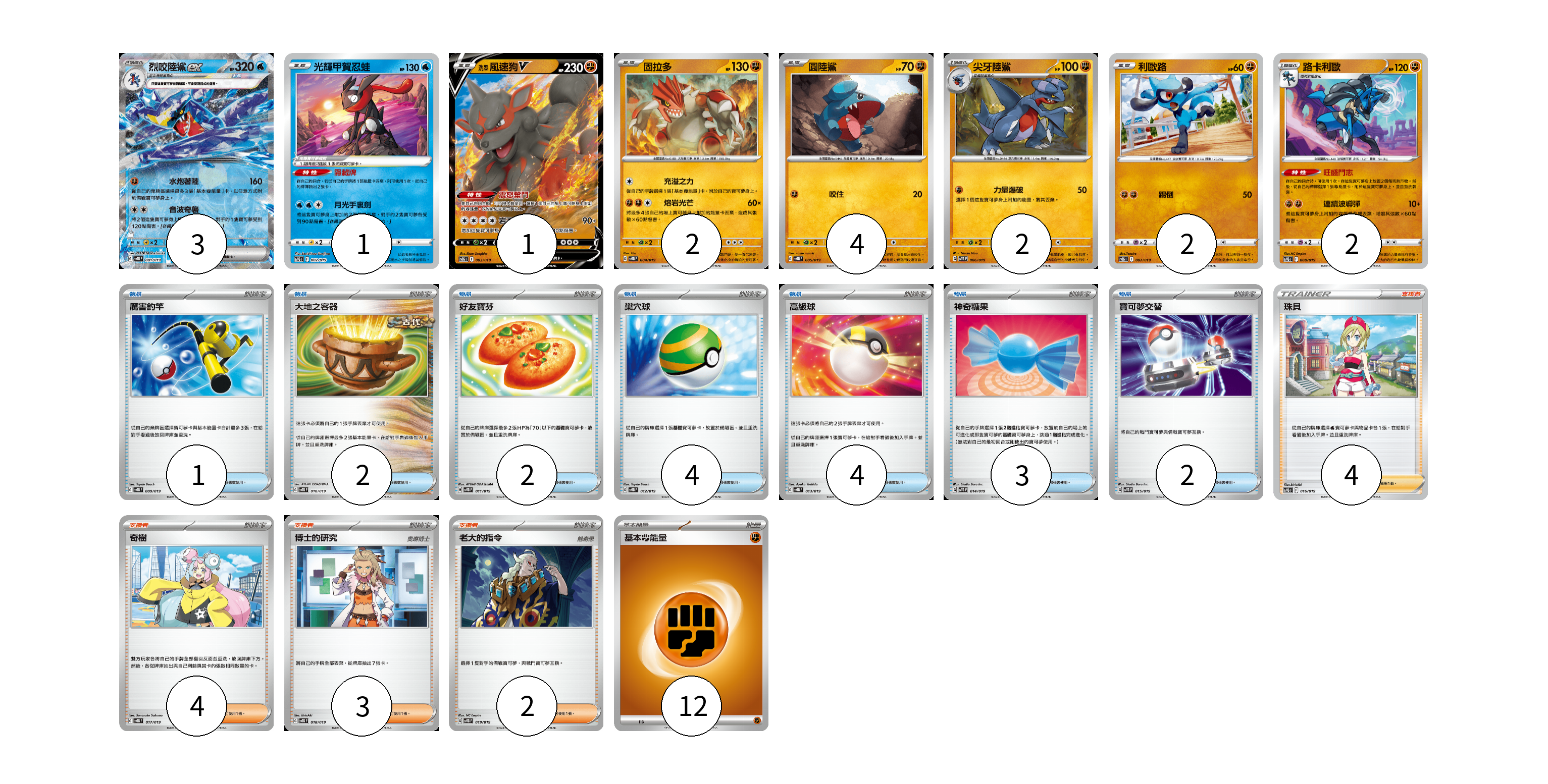 牌組構築方案 以此牌組為基礎新構築牌組 顯示卡面 顯示列表 寶可夢卡(17) 3 1 1 2 4 2 2 2 物品卡(18) 1 2 2 4 4 3 2 支援者卡(13) 4 4 3 2 能量卡(12) 12 寶可夢卡(17) 卡牌名稱 張數 卡牌名稱 張數 烈咬陸鯊ex SVTG 001/019 03 光輝甲賀忍蛙 SVTG 002/019 01 洗翠 風速狗V SVTG 003/019 01 固拉多 SVTG 004/019 02 圓陸鯊 SVTG 005/019 04 尖牙陸鯊 SVTG 006/019 02 利歐路 SVTG 007/019 02 路卡利歐 SVTG 008/019 02 物品卡(18) 卡牌名稱 張數 卡牌名稱 張數 厲害釣竿 SVTG 009/019 01 大地之容器 SVTG 010/019 02 好友寶芬 SVTG 011/019 02 巢穴球 SVTG 012/019 04 高級球 SVTG 013/019 04 神奇糖果 SVTG 014/019 03 寶可夢交替 SVTG 015/019 02 支援者卡(13) 卡牌名稱 張數 卡牌名稱 張數 珠貝 SVTG 016/019 04 奇樹 SVTG 017/019 04 博士的研究 SVTG 018/019 03 老大的指令 SVTG 019/019 02 能量卡(12) 卡牌名稱 張數 卡牌名稱 張數 基本【鬥】能量 SVTG FIG 12 以此牌組為基礎新構築牌組 牌組編碼 zrpHVB-Qtidwe-MLiFWy copy 列印牌組單 牌組編碼已複製 分享至SNS