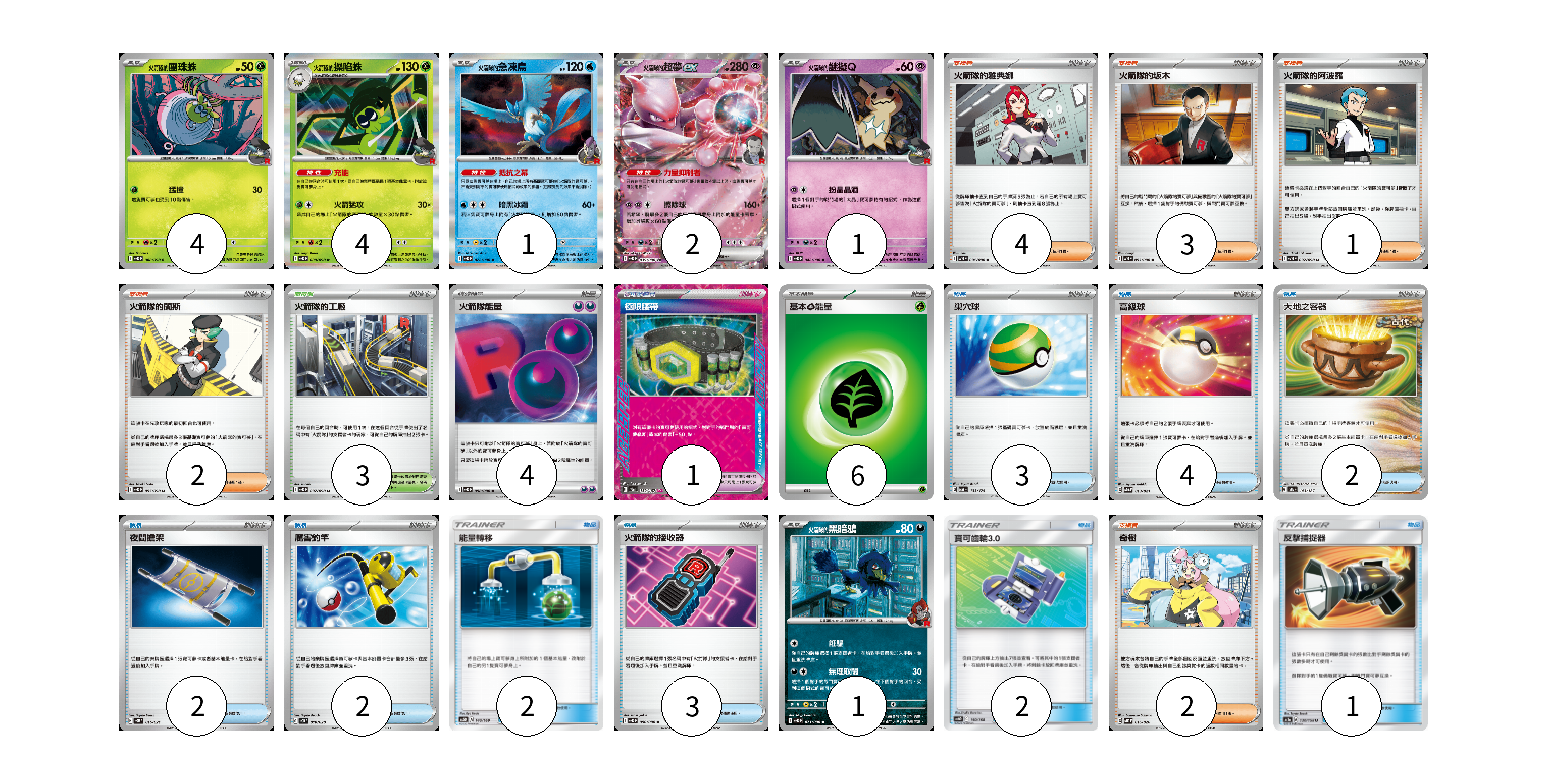 牌組構築方案 以此牌組為基礎新構築牌組 顯示卡面 顯示列表 寶可夢卡(13) 4 4 1 2 1 1 寶可夢道具(1) 1 物品卡(21) 3 4 2 2 2 2 3 2 1 支援者卡(12) 4 3 1 2 2 競技場卡(3) 3 能量卡(10) 4 6 寶可夢卡(13) 卡牌名稱 張數 卡牌名稱 張數 <火箭隊的>團珠蛛 SV10 008/098 04 <火箭隊的>操陷蛛 SV10 009/098 04 <火箭隊的>急凍鳥 SV10 022/098 01 <火箭隊的>超夢ex SV10 039/098 02 <火箭隊的>謎擬Q SV10 042/098 01 <火箭隊的>黑暗鴉 SV10 071/098 01 寶可夢道具(1) 卡牌名稱 張數 卡牌名稱 張數 極限腰帶 SV8a 159/187 01 物品卡(21) 卡牌名稱 張數 卡牌名稱 張數 巢穴球 SVM 133/175 03 高級球 SVOM 013/021 04 大地之容器 SV8a 143/187 02 夜間擔架 SVOM 016/021 02 厲害釣竿 SVOD 010/020 02 能量轉移 AS5D 140/169 02 火箭隊的接收器 SV10 090/098 03 寶可齒輪3.0 AS6D 150/168 02 反擊捕捉器 AC1a 130/158 01 支援者卡(12) 卡牌名稱 張數 卡牌名稱 張數 火箭隊的雅典娜 SV10 091/098 04 火箭隊的坂木 SV10 093/098 03 火箭隊的阿波羅 SV10 092/098 01 火箭隊的蘭斯 SV10 095/098 02 奇樹 SVOD 016/020 02 競技場卡(3) 卡牌名稱 張數 卡牌名稱 張數 火箭隊的工廠 SV10 097/098 03 能量卡(10) 卡牌名稱 張數 卡牌名稱 張數 火箭隊能量 SV10 098/098 04 基本【草】能量 SVTM GRA 06 以此牌組為基礎新構築牌組 牌組編碼 zsHcnu-aNGanz-zPFUvQ copy 列印牌組單 牌組編碼已複製 分享至SNS