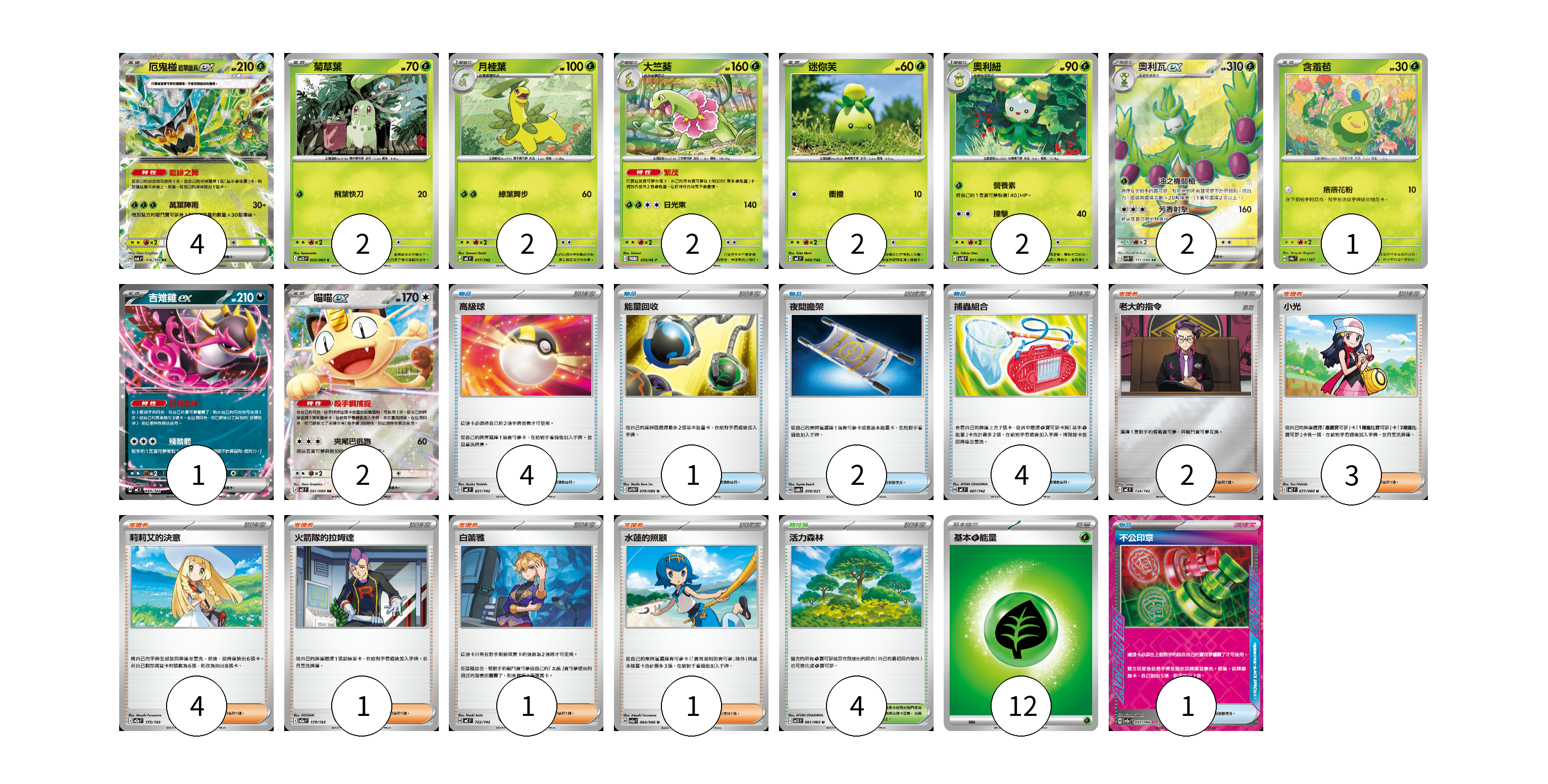牌組構築方案 以此牌組為基礎新構築牌組 顯示卡面 顯示列表 寶可夢卡(20) 4 2 2 2 2 2 2 1 1 2 物品卡(12) 4 1 2 4 1 支援者卡(12) 2 3 4 1 1 1 競技場卡(4) 4 能量卡(12) 12 寶可夢卡(20) 卡牌名稱 張數 卡牌名稱 張數 厄鬼椪 碧草面具ex SV6 016/101 04 菊草葉 M1S 003/063 02 月桂葉 MC 017/742 02 大竺葵 M-P 055/M-P 02 迷你芙 MC 069/742 02 奧利紐 SV10 011/098 02 奧利瓦ex SV10 111/098 02 含羞苞 SV8a 001/187 01 吉雉雞ex MC 489/742 01 喵喵ex M3 061/080 02 物品卡(12) 卡牌名稱 張數 卡牌名稱 張數 高級球 MC 651/742 04 能量回收 SV11W 079/086 01 夜間擔架 SVOM 016/021 02 捕蟲組合 MC 667/742 04 不公印章 SV5a 053/066 01 支援者卡(12) 卡牌名稱 張數 卡牌名稱 張數 老大的指令 MC 724/742 02 小光 M2 077/080 03 莉莉艾的決意 M2a 175/193 04 火箭隊的拉姆達 M2a 179/193 01 白蕾雅 MC 722/742 01 水蓮的照顧 SV5a 064/066 01 競技場卡(4) 卡牌名稱 張數 卡牌名稱 張數 活力森林 M1S 061/063 04 能量卡(12) 卡牌名稱 張數 卡牌名稱 張數 基本【草】能量 MJ GRA 12 以此牌組為基礎新構築牌組 牌組編碼 zswEWR-QpYsnd-RJFkID copy 列印牌組單 牌組編碼已複製 分享至SNS