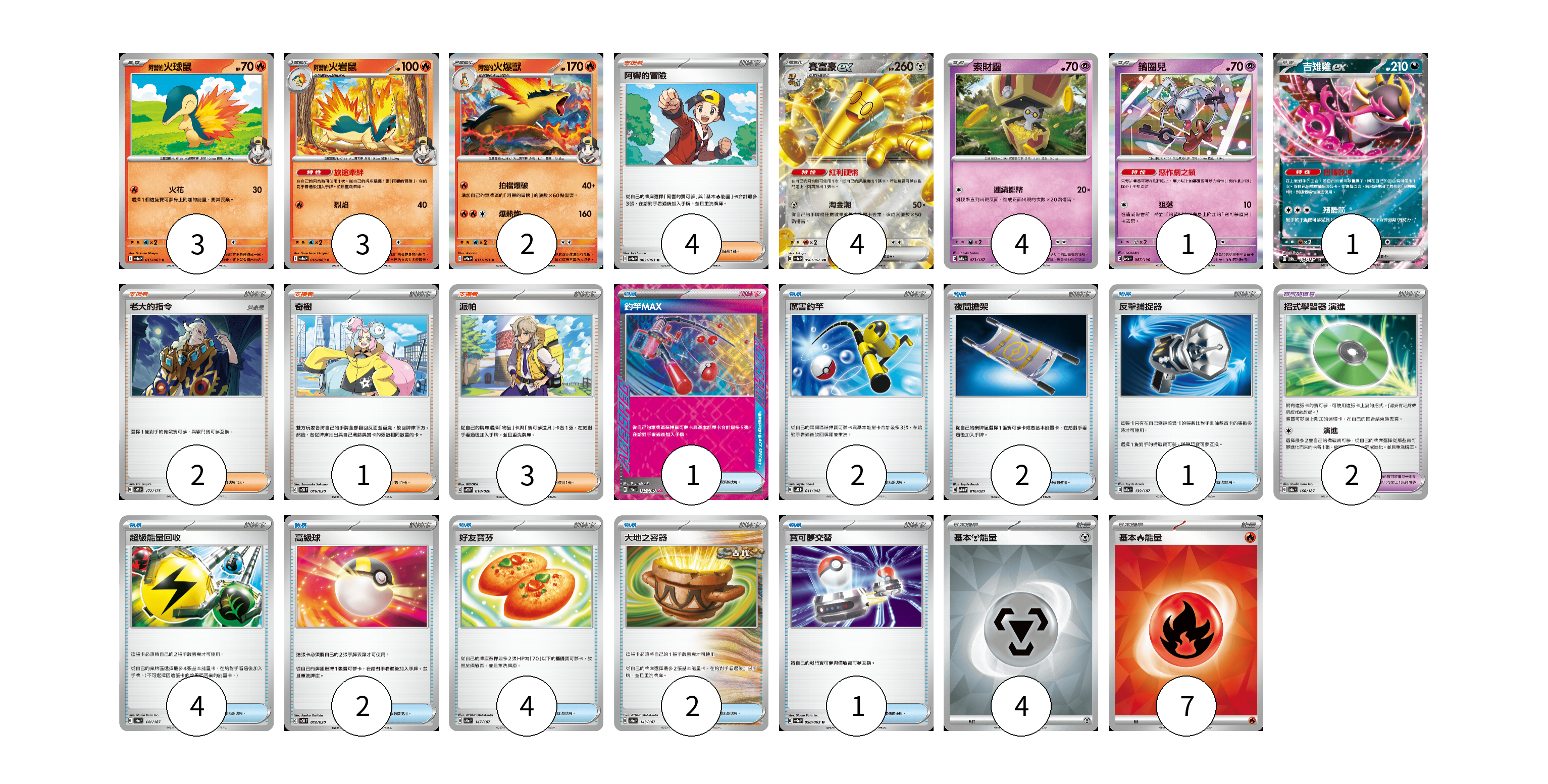 牌組構築方案 以此牌組為基礎新構築牌組 顯示卡面 顯示列表 寶可夢卡(18) 3 3 2 4 4 1 1 寶可夢道具(2) 2 物品卡(19) 1 2 2 1 4 2 4 2 1 支援者卡(10) 4 2 1 3 能量卡(11) 4 7 寶可夢卡(18) 卡牌名稱 張數 卡牌名稱 張數 <阿響的>火球鼠 SV9a 015/063 03 <阿響的>火岩鼠 SV9a 016/063 03 <阿響的>火爆獸 SV9a 017/063 02 賽富豪ex SV3a 050/062 04 索財靈 SV8a 073/187 04 鑰圈兒 SV4a 087/190 01 吉雉雞ex SV8a 104/187 01 寶可夢道具(2) 卡牌名稱 張數 卡牌名稱 張數 招式學習器 演進 SV8a 160/187 02 物品卡(19) 卡牌名稱 張數 卡牌名稱 張數 釣竿MAX SV8a 142/187 01 厲害釣竿 SVK 011/042 02 夜間擔架 SVOM 016/021 02 反擊捕捉器 SV8a 139/187 01 超級能量回收 SV8a 141/187 04 高級球 SVOD 012/020 02 好友寶芬 SV8a 147/187 04 大地之容器 SV8a 143/187 02 寶可夢交替 SV9a 058/063 01 支援者卡(10) 卡牌名稱 張數 卡牌名稱 張數 阿響的冒險 SV9a 063/063 04 老大的指令 SVM 172/175 02 奇樹 SVOD 016/020 01 派帕 SVOD 018/020 03 能量卡(11) 卡牌名稱 張數 卡牌名稱 張數 基本【鋼】能量 SVOD MET 04 基本【火】能量 SVK FIR 07 以此牌組為基礎新構築牌組 牌組編碼 zwqPxN-svjxoo-olhJkI copy 列印牌組單 牌組編碼已複製 分享至SNS