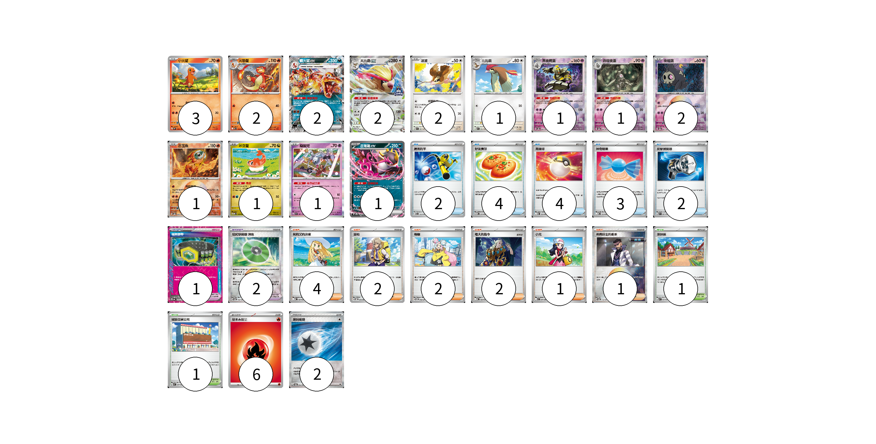牌組構築方案 以此牌組為基礎新構築牌組 顯示卡面 顯示列表 寶可夢卡(22) 3 2 2 2 2 1 1 1 2 1 1 1 1 2 寶可夢道具(3) 1 2 物品卡(13) 4 4 3 2 支援者卡(12) 4 2 2 2 1 1 競技場卡(2) 1 1 能量卡(8) 6 2 寶可夢卡(22) 卡牌名稱 張數 卡牌名稱 張數 小火龍 SV2a 004/165 03 火恐龍 M2 012/080 02 噴火龍ex SV-P 166/SV-P 02 大比鳥ex SV-P 183/SV-P 02 波波 SVK 003/042 02 比比鳥 SVK 004/042 01 黑夜魔靈 SV8a 066/187 01 彷徨夜靈 SV8a 065/187 01 夜巡靈 SV8a 064/187 02 古玉魚 SV8a 025/187 01 米立龍 MBD 010/022 01 鑰圈兒 SV4a 087/190 01 吉雉雞ex SVOM 009/021 01 厲害釣竿 SVEL 010/020 02 寶可夢道具(3) 卡牌名稱 張數 卡牌名稱 張數 極限腰帶 SV8a 159/187 01 招式學習器 演進 SV8a 160/187 02 物品卡(13) 卡牌名稱 張數 卡牌名稱 張數 好友寶芬 MBG 011/022 04 高級球 MBG 012/022 04 神奇糖果 MBG 013/022 03 反擊捕捉器 SVK 009/042 02 支援者卡(12) 卡牌名稱 張數 卡牌名稱 張數 莉莉艾的決意 MBD 021/022 04 派帕 SVOD 018/020 02 奇樹 SVOM 018/021 02 老大的指令 MBD 020/022 02 小光 M2 077/080 01 弗圖博士的劇本 SV8a 175/187 01 競技場卡(2) 卡牌名稱 張數 卡牌名稱 張數 深缽鎮 SVK 039/042 01 城鎮百貨公司 SVK 037/042 01 能量卡(8) 卡牌名稱 張數 卡牌名稱 張數 基本火能量 sv-p FIR 06 噴射能量 SV8a 185/187 02 以此牌組為基礎新構築牌組 牌組編碼 zxaJRh-KOUjxl-BYDHjJ copy 列印牌組單 牌組編碼已複製 分享至SNS
