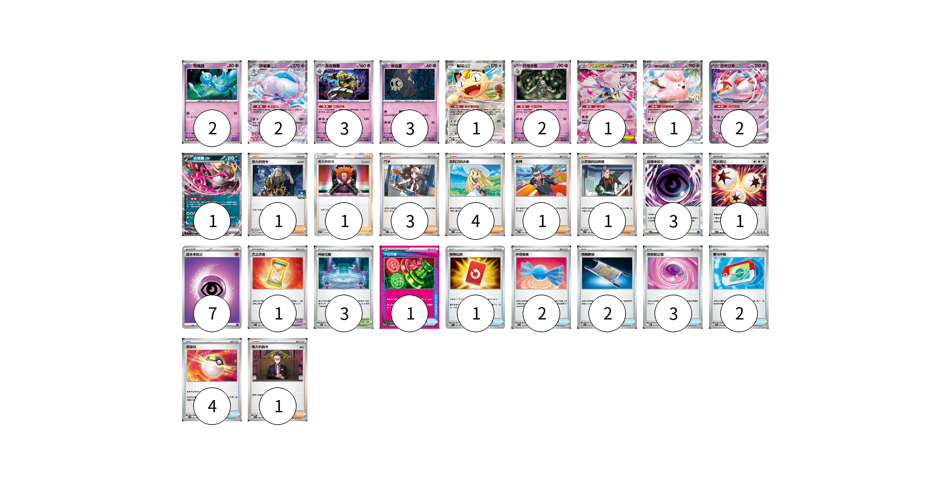 牌組構築方案 以此牌組為基礎新構築牌組 顯示卡面 顯示列表 寶可夢卡(18) 2 2 3 3 1 2 1 1 2 1 寶可夢道具(1) 1 物品卡(15) 1 1 2 2 3 2 4 支援者卡(12) 1 1 3 4 1 1 1 競技場卡(3) 3 能量卡(11) 3 1 7 寶可夢卡(18) 卡牌名稱 張數 卡牌名稱 張數 輕飄飄 SV11W 041/086 02 胖嘟嘟ex SV11W 042/086 02 黑夜魔靈 MC 310/742 03 夜巡靈 MC 308/742 03 喵喵ex M3 061/080 01 彷徨夜靈 MC 309/742 02 超級蒂安希ex MBD 006/022 01 莉莉艾的皮皮ex M2a 060/193 01 拉帝亞斯ex MC 312/742 02 吉雉雞ex MC 489/742 01 寶可夢道具(1) 卡牌名稱 張數 卡牌名稱 張數 力之沙漏 MC 683/742 01 物品卡(15) 卡牌名稱 張數 卡牌名稱 張數 不公印章 MC 633/742 01 特殊紅牌 M4 072/083 01 神奇糖果 MC 655/742 02 夜間擔架 MC 670/742 02 奇跡修正檔 MBD 017/022 03 寶可平板 M3 070/080 02 高級球 MC 651/742 04 支援者卡(12) 卡牌名稱 張數 卡牌名稱 張數 老大的指令 SV-P 178/SV-P 01 老大的指令(弗拉達利) S8b 158/184 01 鬥子 MC 718/742 03 莉莉艾的決意 MC 729/742 04 裁判 MC 711/742 01 火箭隊的拉姆達 MC 734/742 01 老大的指令 MC 724/742 01 競技場卡(3) 卡牌名稱 張數 卡牌名稱 張數 神秘花園 M2a 187/193 03 能量卡(11) 卡牌名稱 張數 卡牌名稱 張數 感應【超】能量 M3 079/080 03 燃火能量 MC 736/742 01 基本【超】能量 M-P PSY 07 以此牌組為基礎新構築牌組 牌組編碼 zzrQYL-DcFWlS-iYUvQa copy 列印牌組單 牌組編碼已複製 分享至SNS