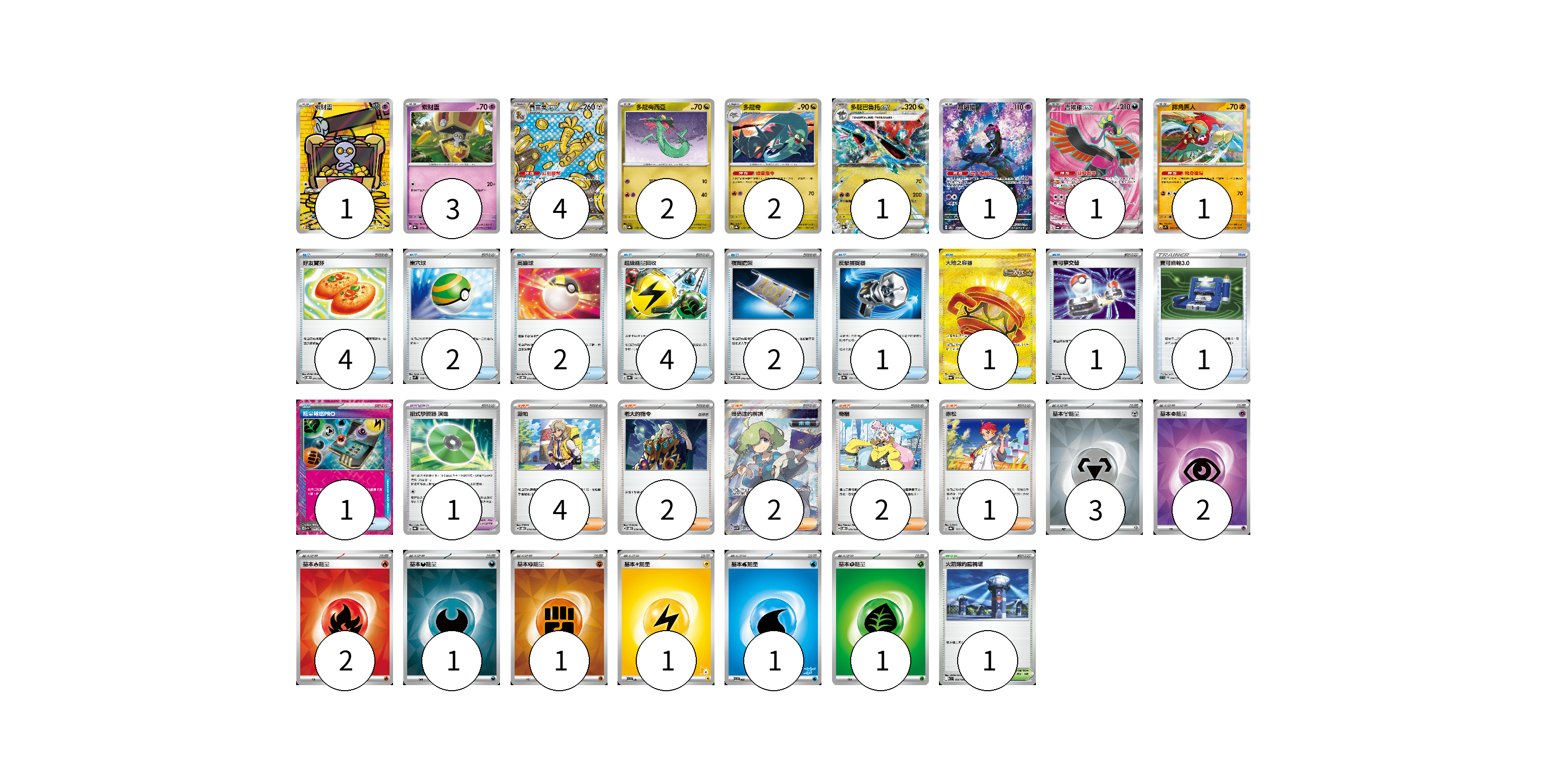 牌組構築方案 以此牌組為基礎新構築牌組 顯示卡面 顯示列表 寶可夢卡(16) 1 3 4 2 2 1 1 1 1 寶可夢道具(1) 1 物品卡(19) 4 2 2 4 2 1 1 1 1 1 支援者卡(11) 4 2 2 2 1 競技場卡(1) 1 能量卡(12) 3 2 2 1 1 1 1 1 寶可夢卡(16) 卡牌名稱 張數 卡牌名稱 張數 索財靈 SV3a 068/062 01 索財靈 SV8a 073/187 03 賽富豪ex SV8a 220/187 04 多龍梅西亞 SV8a 118/187 02 多龍奇 SV8a 119/187 02 多龍巴魯托ex SV8a 120/187 01 願增猿 SV6 107/101 01 吉雉雞ex SV6a 081/064 01 摔角鷹人 SV1S 045/078 01 寶可夢道具(1) 卡牌名稱 張數 卡牌名稱 張數 招式學習器 演進 SV8a 160/187 01 物品卡(19) 卡牌名稱 張數 卡牌名稱 張數 好友寶芬 SVOD 011/020 04 巢穴球 SVM 133/175 02 高級球 SVOD 012/020 02 超級能量回收 SV8a 141/187 04 夜間擔架 SVOM 016/021 02 反擊捕捉器 SV8a 139/187 01 大地之容器 SV6a 093/064 01 寶可夢交替 SV9a 058/063 01 寶可齒輪3.0 SLD 014/020 01 能量輸送PRO SV7a 052/064 01 支援者卡(11) 卡牌名稱 張數 卡牌名稱 張數 派帕 SVOD 018/020 04 老大的指令 SVOD 019/020 02 暗碼迷的解讀 SV5M 090/071 02 奇樹 SVOD 016/020 02 赤松 SV8a 163/187 01 競技場卡(1) 卡牌名稱 張數 卡牌名稱 張數 火箭隊的監視塔 SV10 096/098 01 能量卡(12) 卡牌名稱 張數 卡牌名稱 張數 基本【鋼】能量 SVOD MET 03 基本【超】能量 SVOD PSY 02 基本【火】能量 SVK FIR 02 基本【惡】能量 SVOM DAR 01 基本【鬥】能量 SVK FIG 01 基本【雷】能量 SVI LIG 01 基本【水】能量 SVI WAT 01 基本【草】能量 SVTM GRA 01 以此牌組為基礎新構築牌組 牌組編碼 zzsNEy-SLLmeZ-bSCqhJ copy 列印牌組單 牌組編碼已複製 分享至SNS