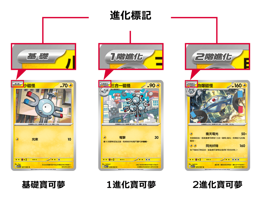 進化階段的確認請見卡牌左上方的「進化標記」。