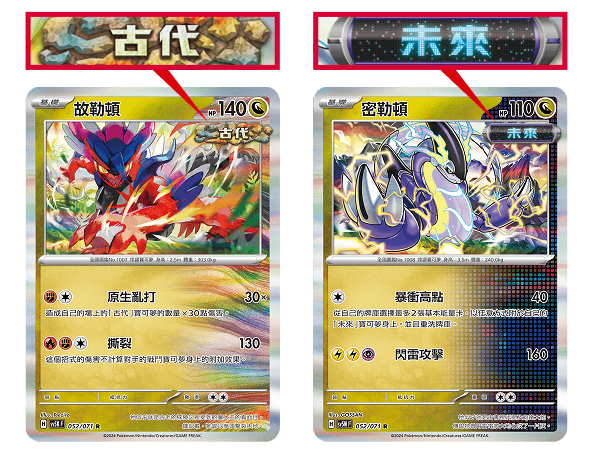 「古代」卡牌與「未來」卡牌中有「寶可夢」卡及「訓練家」卡,分別標有「古代」或「未來」標記。